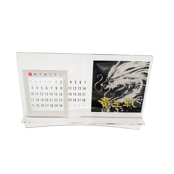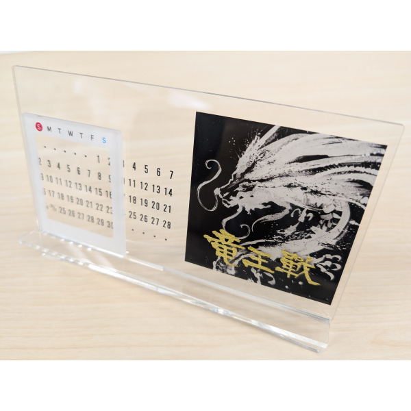 アクリルスタンドに龍の絵柄を施した竜王戦ロゴ入りの万年カレンダー付アクリルスタンドです。