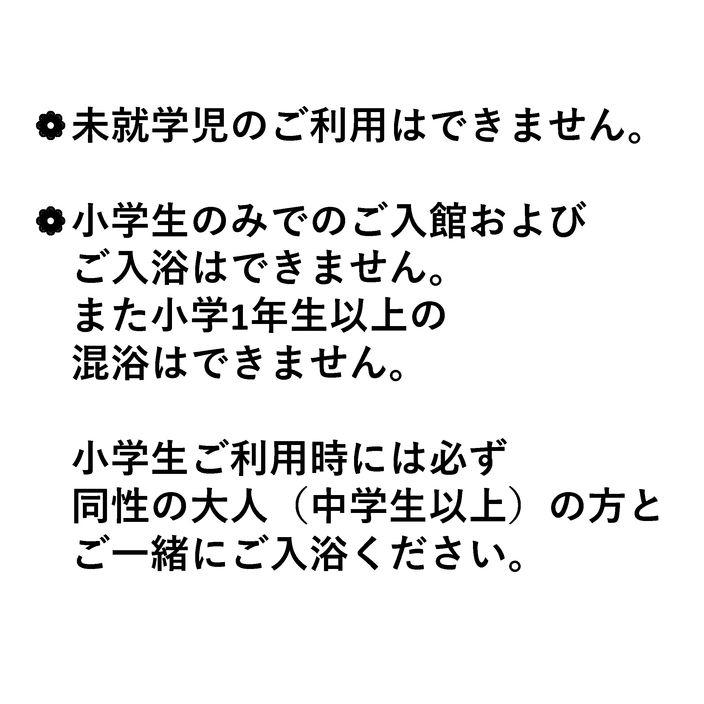 ・小学生のみでのご入館およびご入浴はできません。また小学1年生以上の混浴はできません。小学生ご利用時には必ず同性の大人(中学生以上)の方とご一緒にご入浴ください。